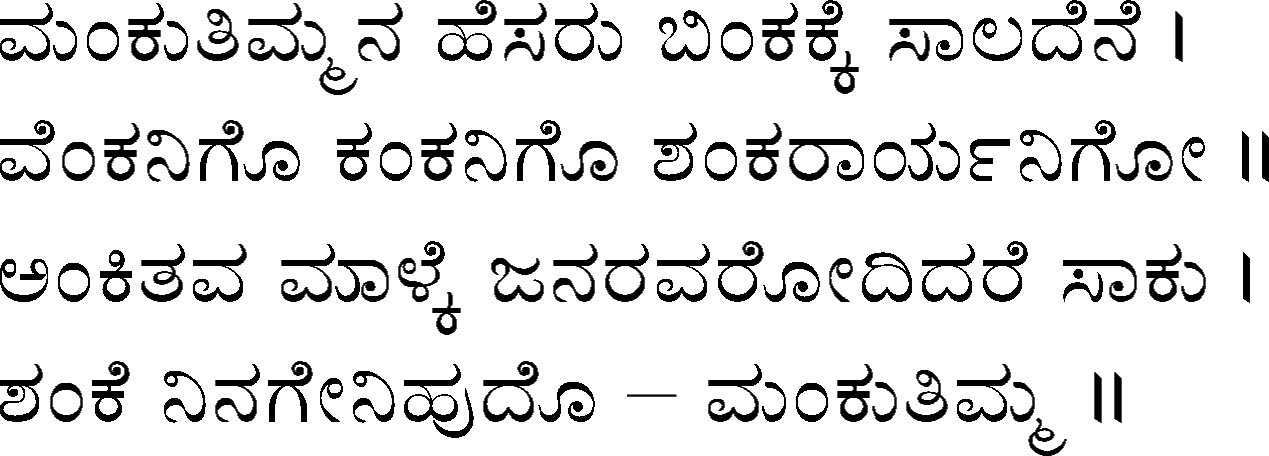 Being a fan of DVG's work, specifically of Kagga, I was then looking for an online resource to periodically review various verses. Not finding any and realizing that the support for rendering Kannada font in web browsers was minimal to non-existent, I combined the two projects - rendering LaTeX expressions as graphics and typesetting Kannada in LaTeX - to typeset, compile and produce all 945 verses as web-friendly PNG images over the next few years. The project was completed and the final verse, #945, was published on 29th August 2010. Sometime in early December 2020, the project files were restored from an old SVN repository into GitHub, higher resolution images were generate using tex2im (Python utility) and incorporated into my journal with originally published dates.
