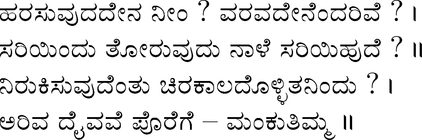 Being a fan of DVG's work, specifically of Kagga, I was then looking for an online resource to periodically review various verses. Not finding any and realizing that the support for rendering Kannada font in web browsers was minimal to non-existent, I combined the two projects - rendering LaTeX expressions as graphics and typesetting Kannada in LaTeX - to typeset, compile and produce all 945 verses as web-friendly PNG images over the next few years. The project was completed and the final verse, #945, was published on 29th August 2010. Sometime in early December 2020, the project files were restored from an old SVN repository into GitHub, higher resolution images were generate using tex2im (Python utility) and incorporated into my journal with originally published dates.