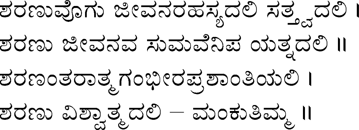 Devanahalli Venkataramanaiah Gundappa - better known as D V Gundappa or better yet just by his initials, DVG - was a writer and philosopher and a stalwart of Kannada (one of the south Indian languages) literature. While he authored numerous works - Antahpura Geete, Umarana Osage, Jnaapaka Chitra Shaale, Jeevana Dharma Yoga, MaruLa Muniyana Kagga, Samskruti, Vasanta Kusumaanjali and more, I believe that Mankutimmana Kagga (loose translation: Dim Tim's Rigmarole) stands out as being most familiar to the masses. Published in 1943, Mankutimmana Kagga (or just Kagga) is a collection of 945 standalone 4-line poems (i.e., muktaka) that conform to a specific grammar rule (i.e., aadipraasa - the second letter in every sentence of a given poem is the same or its variant). Their elegance and beauty, to me anyway, is that the scope of their meaning and one's understanding in turn seem to grow with one's experiences in life.